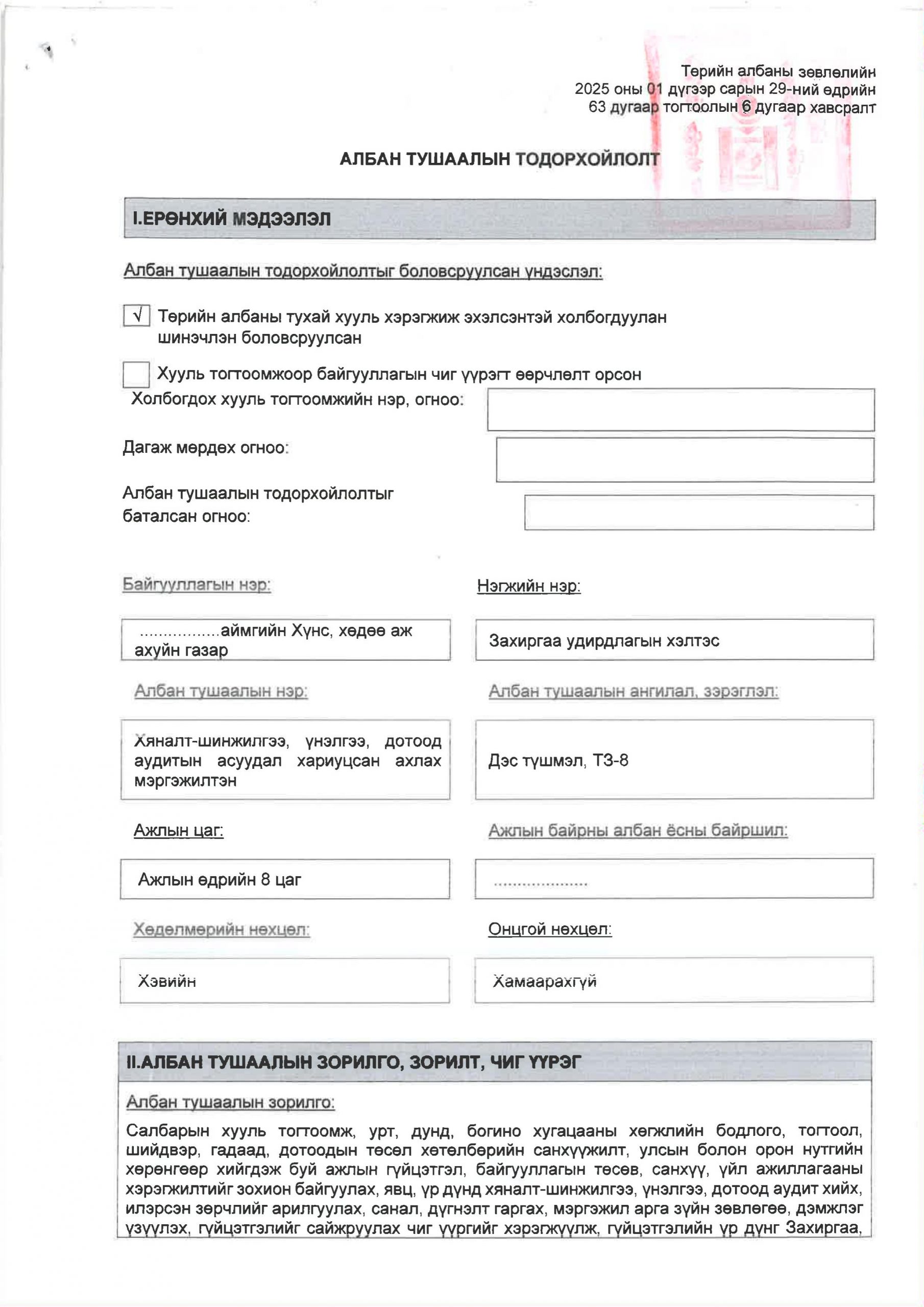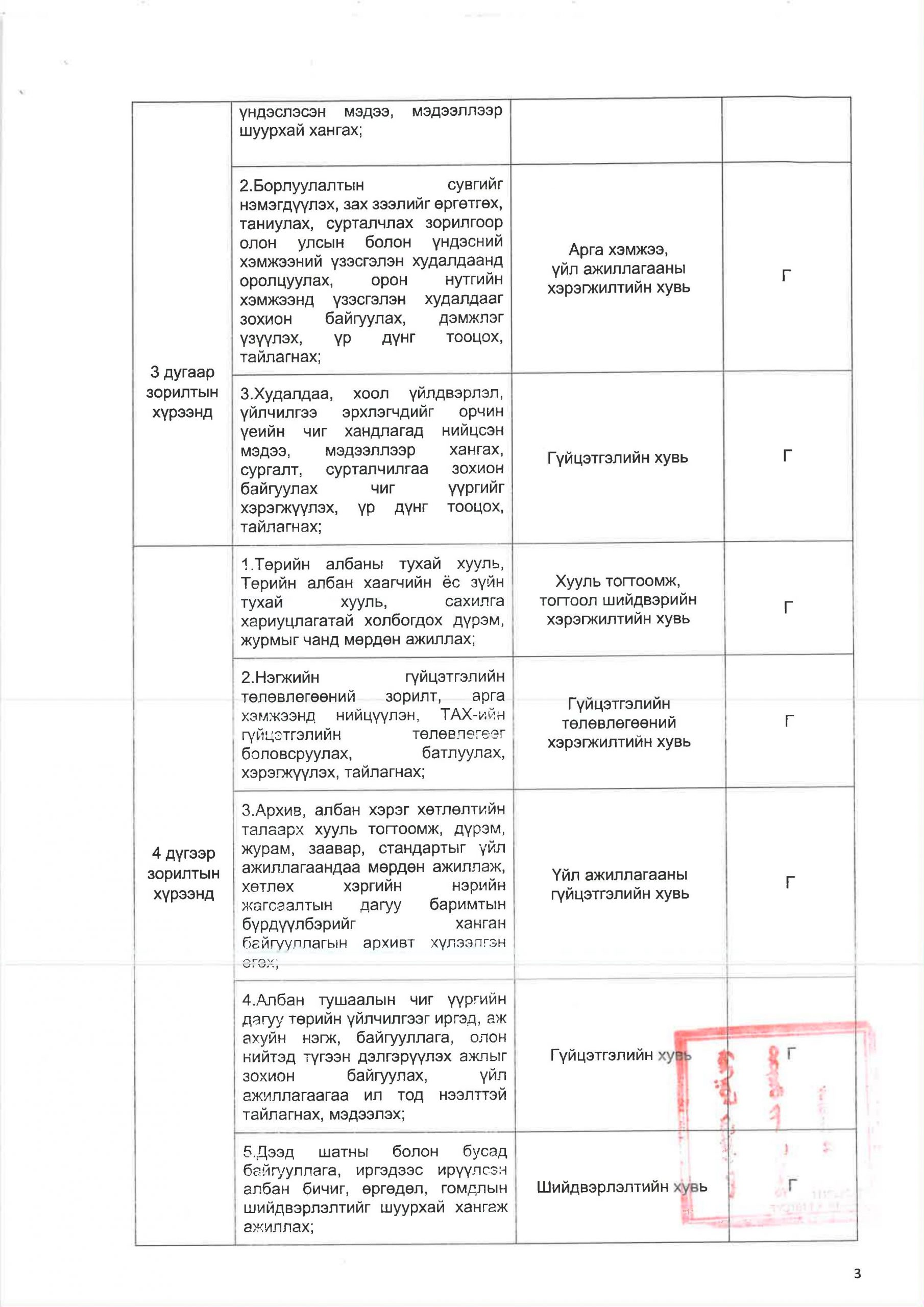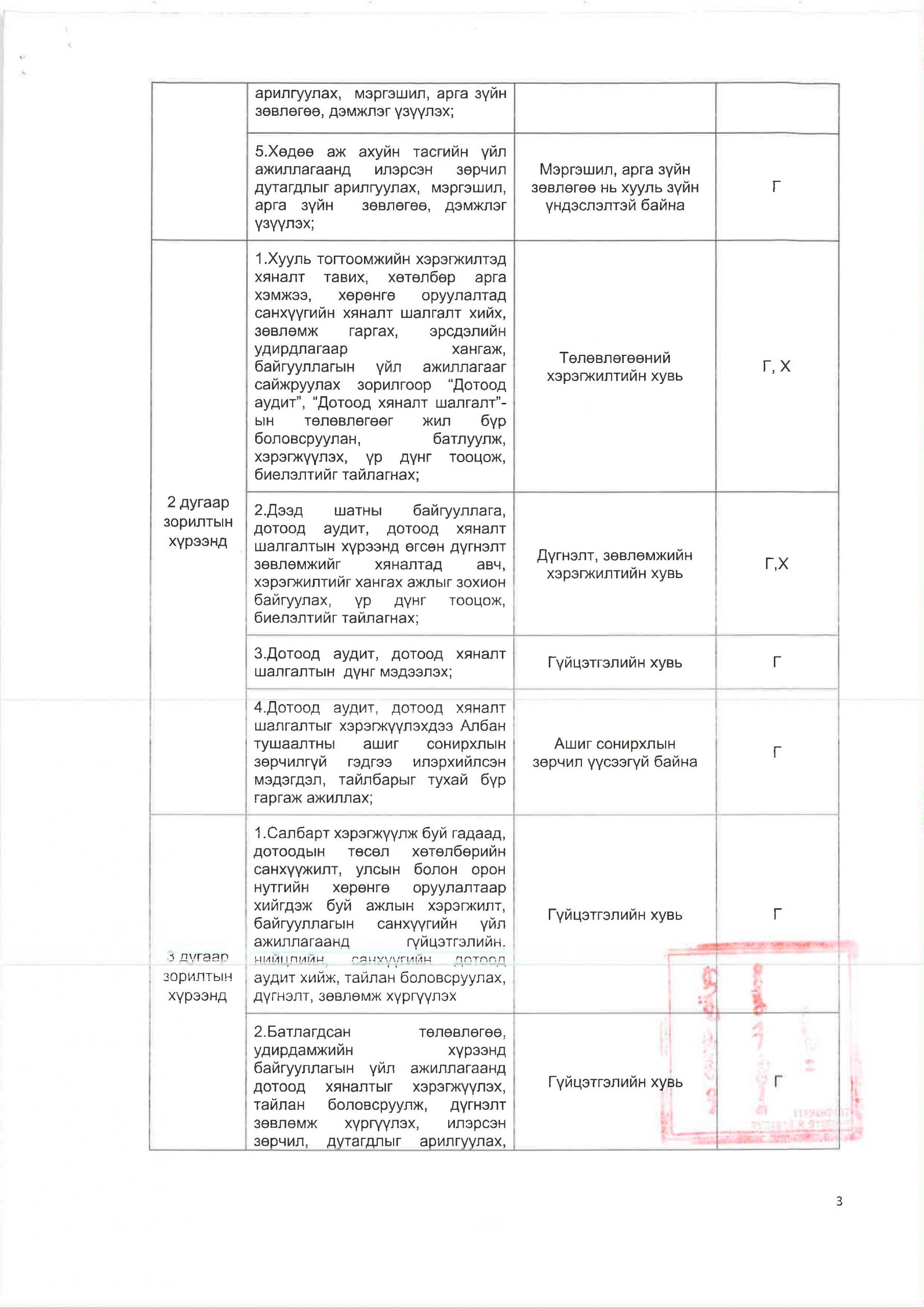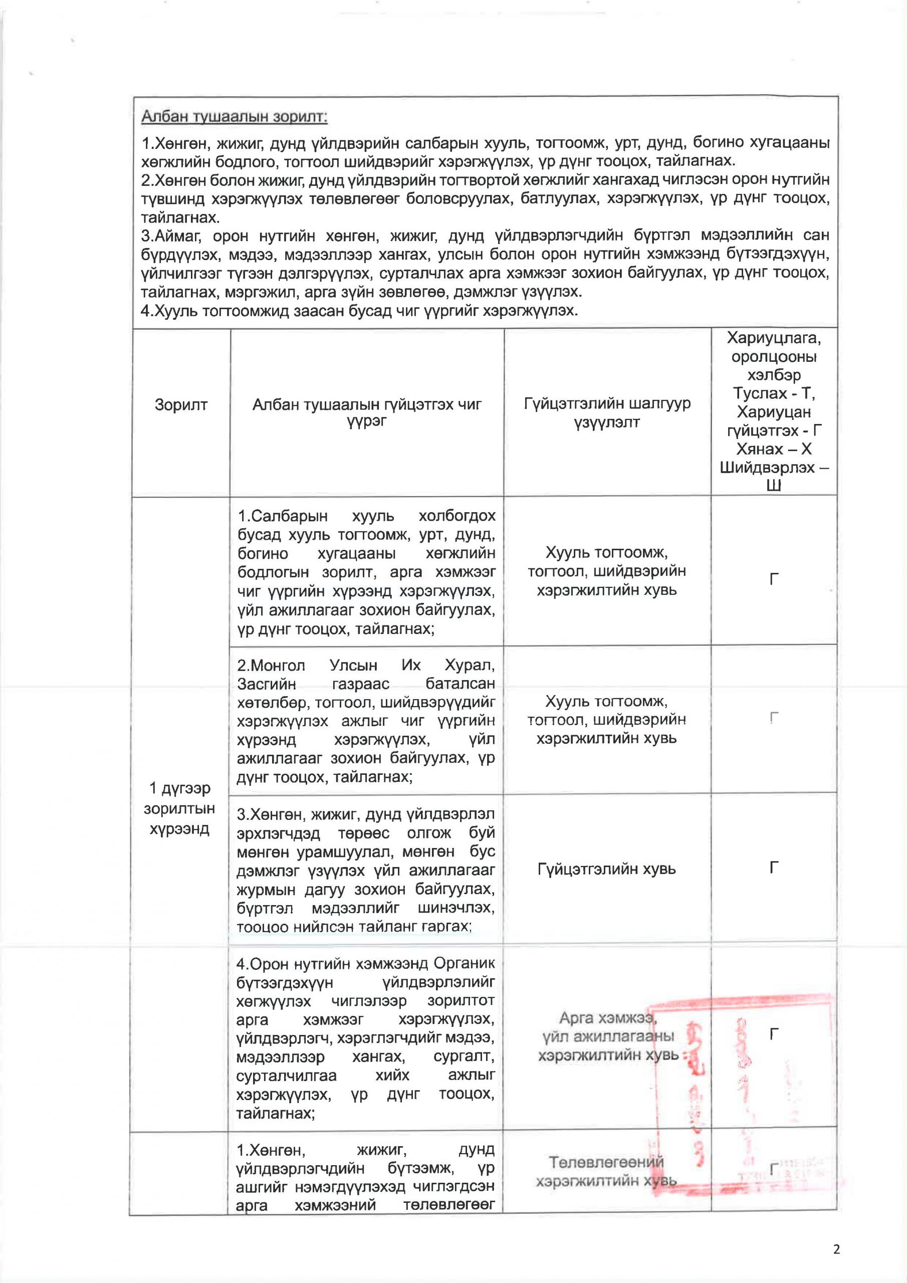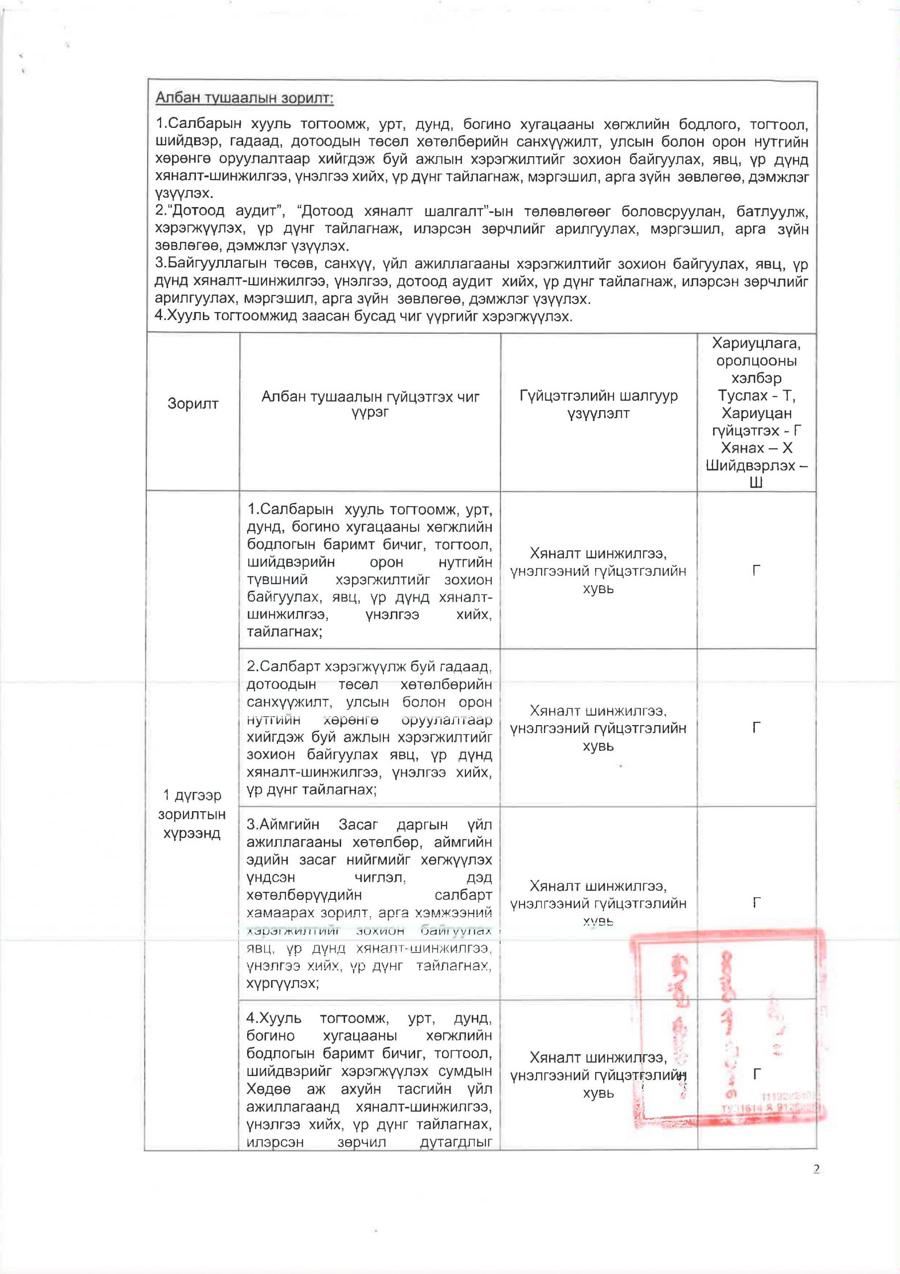 Дэлгэрэнгүй мэдээлэл авах эх сурвалж: Захиргаа удирдлагын хэлтсийн Хяналт шинжилгээ, үнэлгээ, дотоод аудит хариуцсан мэргэжилтэн Э.Алтантуяа