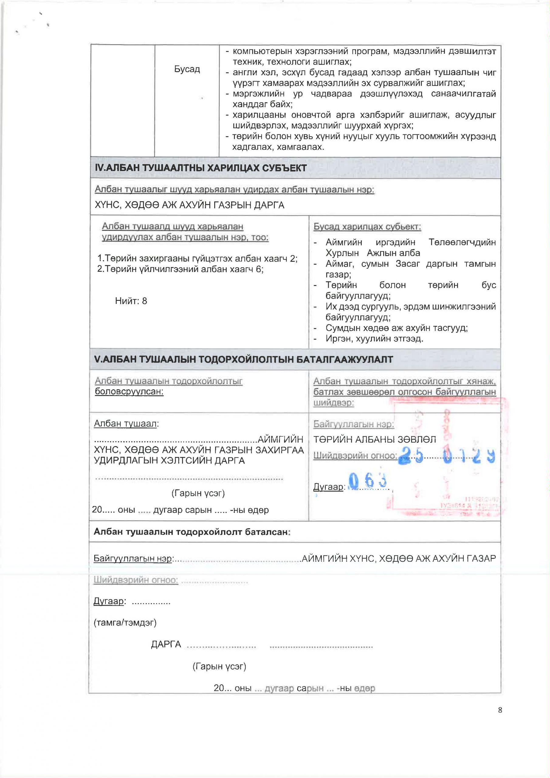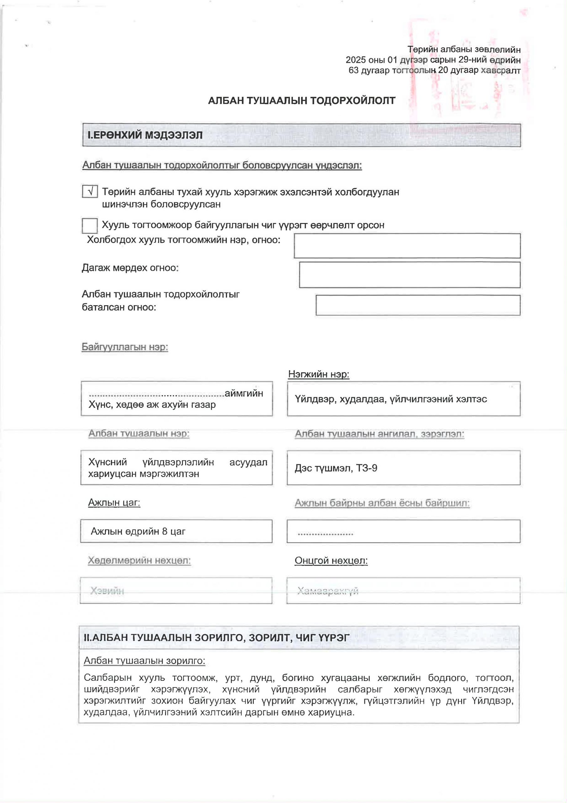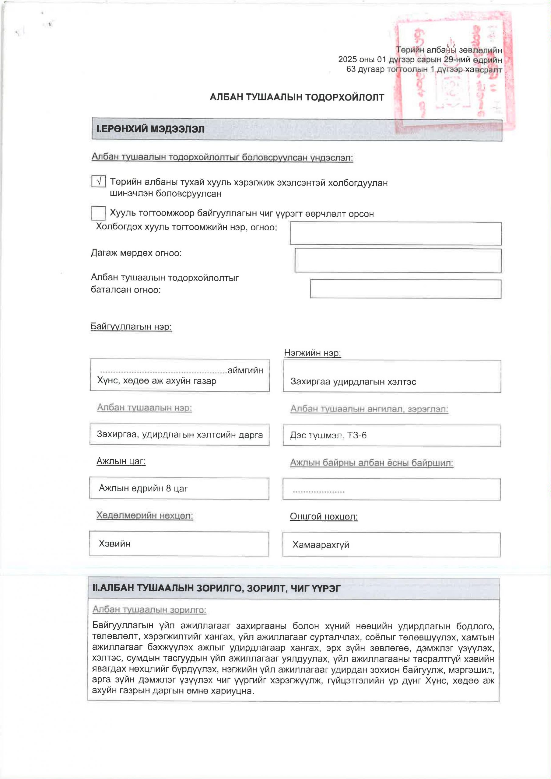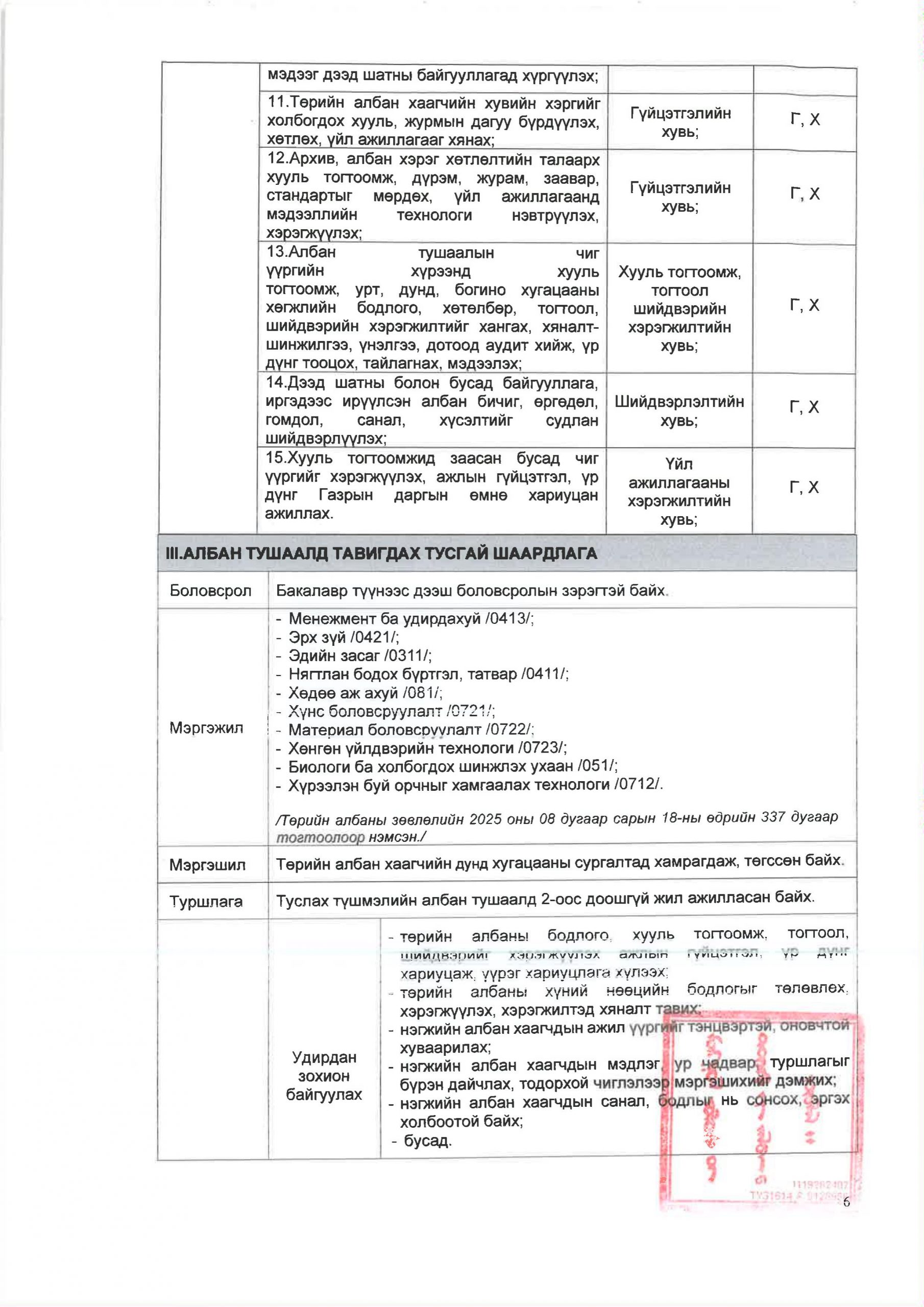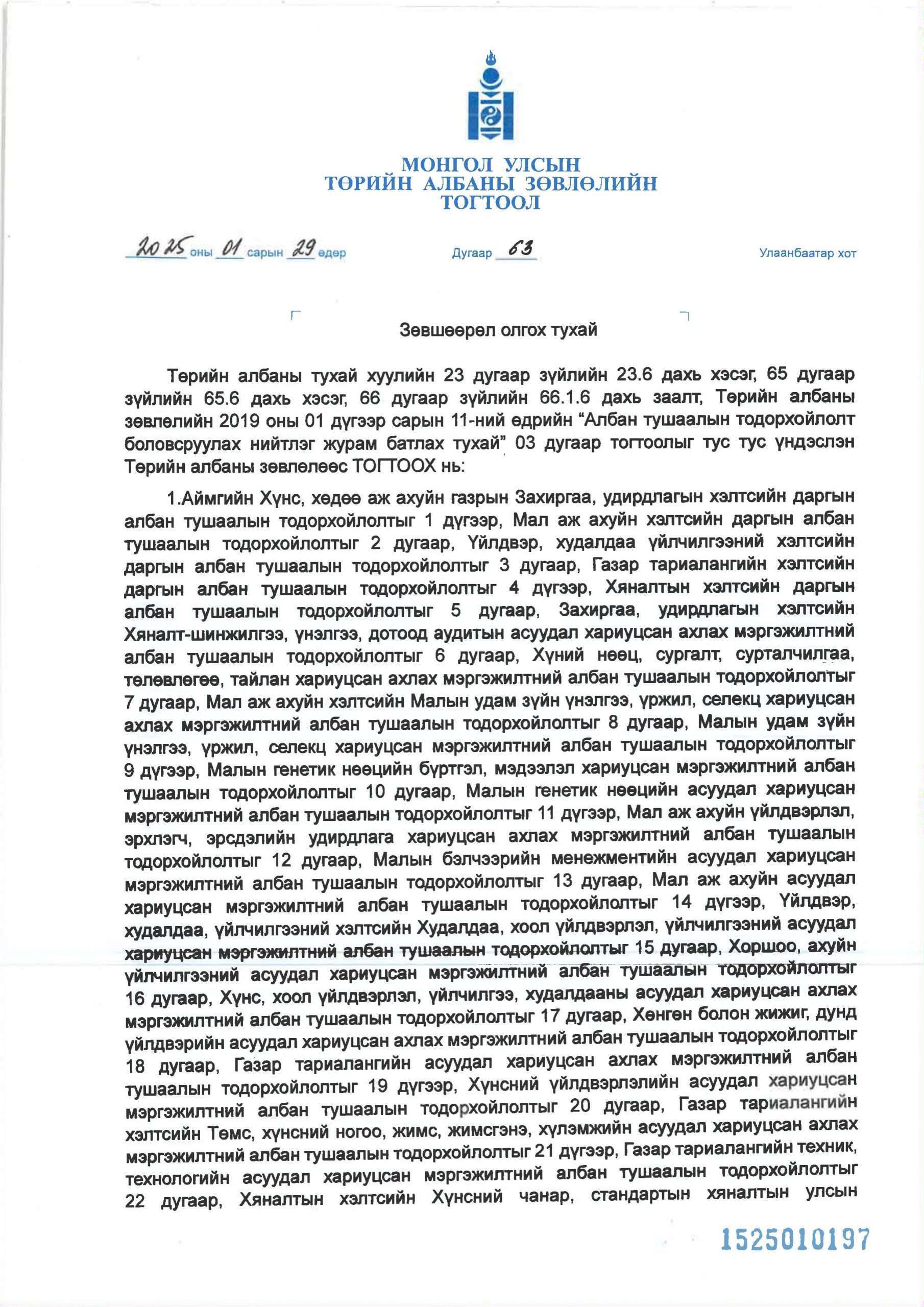 Дэлгэрэнгүй мэдээлэл авах эх сурвалж: Захиргаа удирдлагын хэлтсийн Хяналт шинжилгээ, үнэлгээ, дотоод аудит хариуцсан мэргэжилтэн Э.Алтантуяа