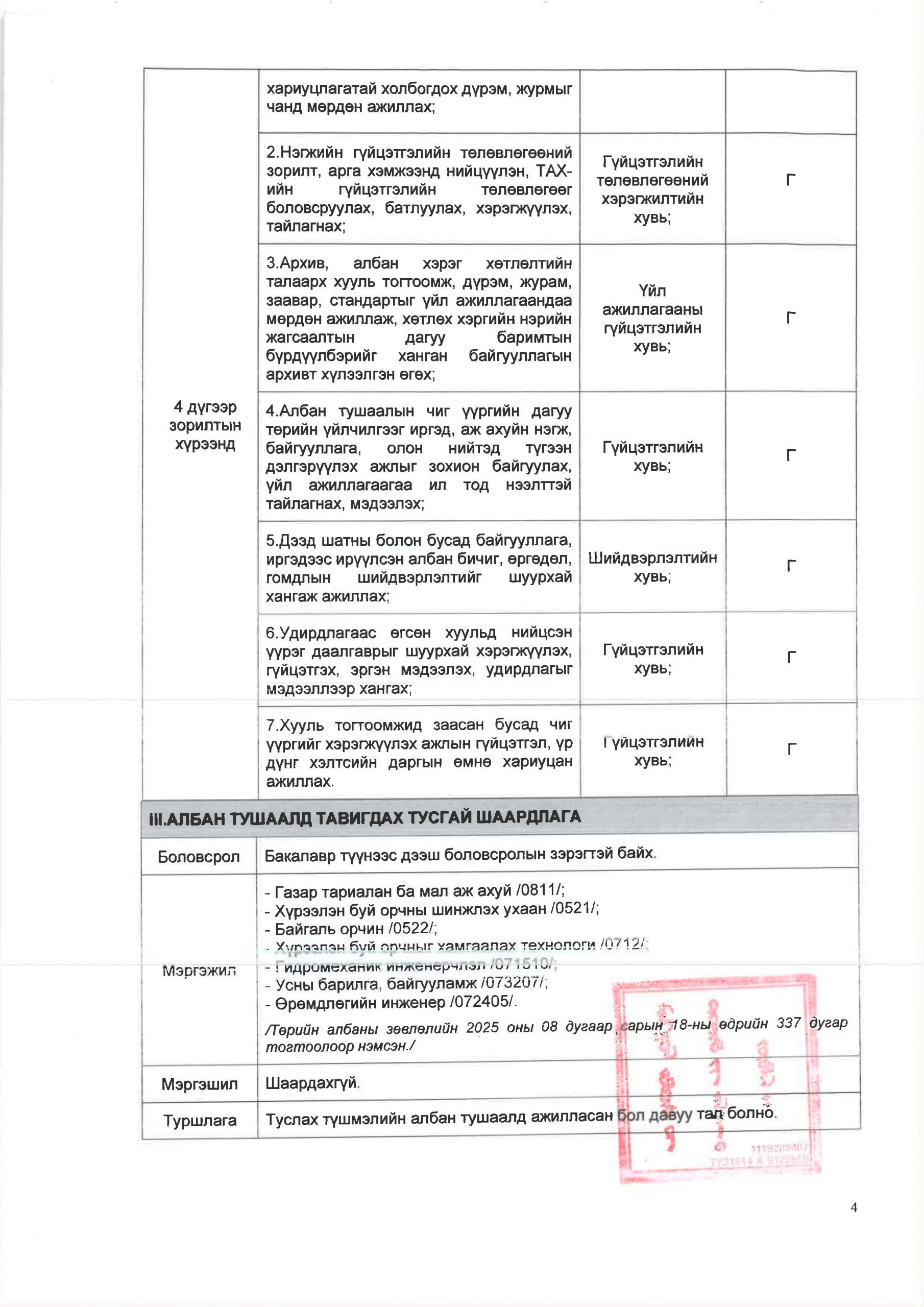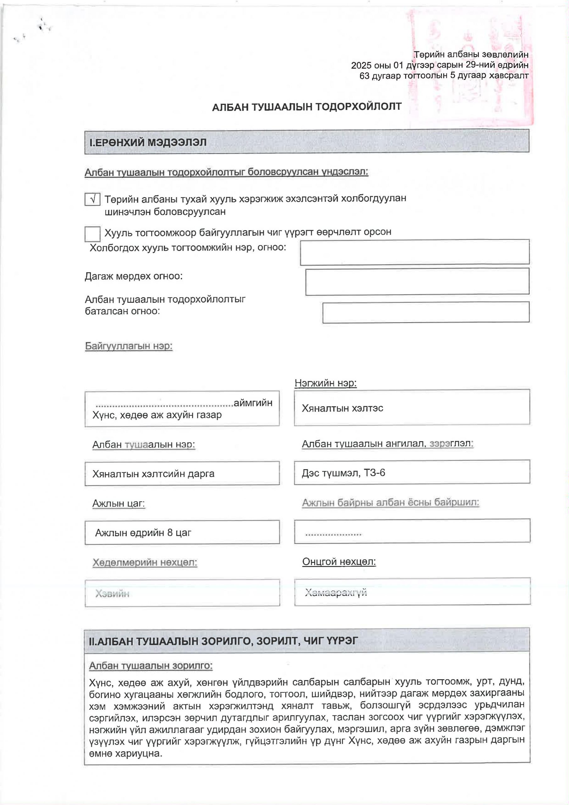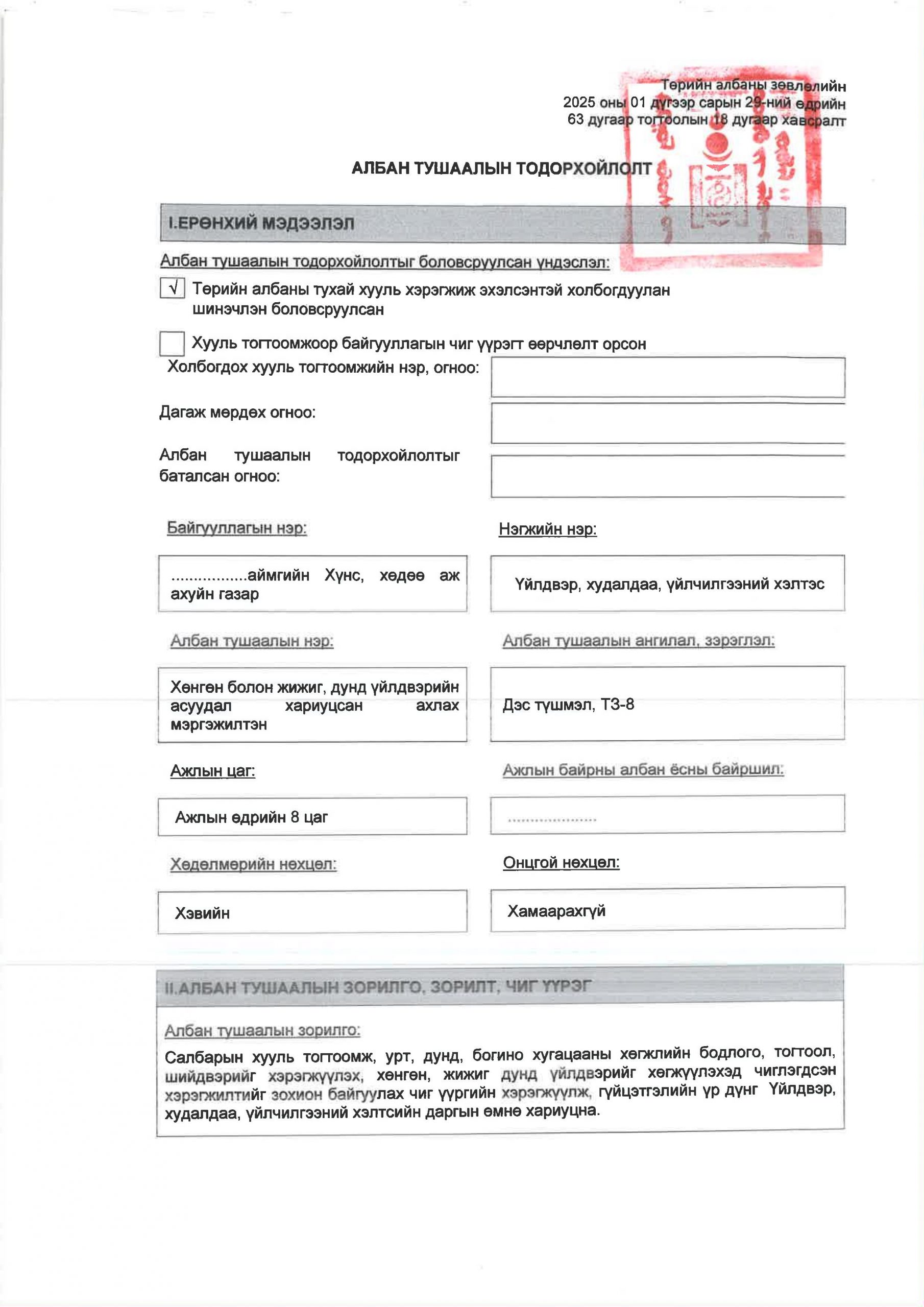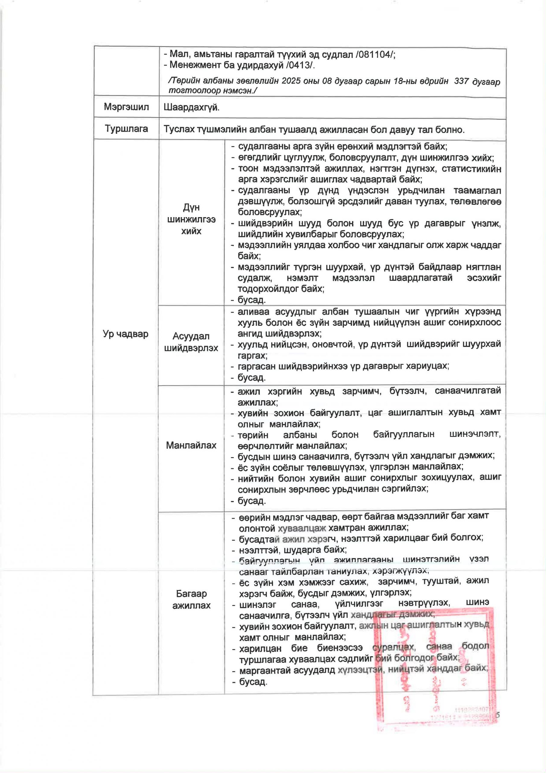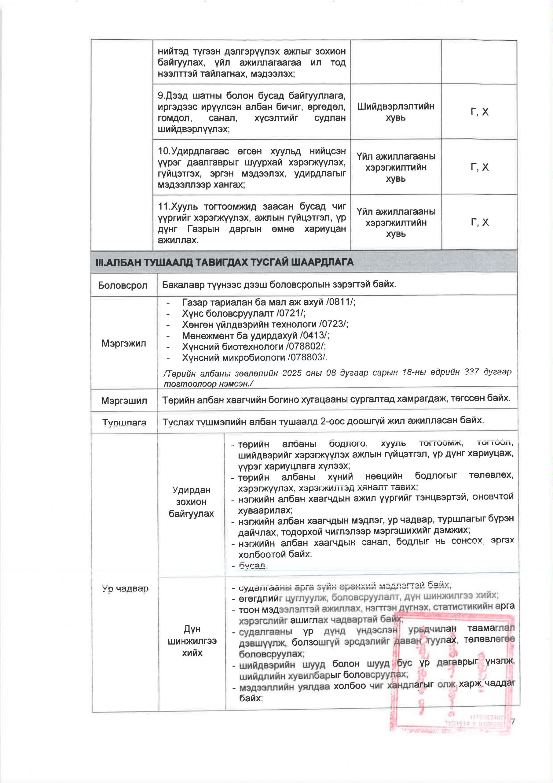 Дэлгэрэнгүй мэдээлэл авах эх сурвалж: Захиргаа удирдлагын хэлтсийн Хяналт шинжилгээ, үнэлгээ, дотоод аудит хариуцсан мэргэжилтэн Э.Алтантуяа